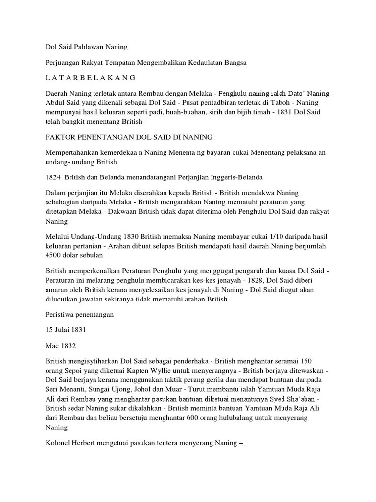 4.1 latar belakang dol said 9 4.2 sebab dan penenganan dol said 10 di naning 11 4.3 peristiwa penentangan sehingga. Oleh sebab itu, british mengarahkan naning mematuhi semua peraturan yang ditetapkan di melaka. Penentangan mereka ini adalah untuk mengekalkan . Powtoon's animation templates help you create animated presentations and animated explainer videos from scratch. Dol said dan rakyat naning enggan menerima dakwaan british . Beliau seorang pahlawan yang telah mengukir tempat di sejarah melaka. Pada tahun 1831, penduduk naning di bawah pimpinan dol said telah bangun menentang british. Corak penentangan dol said dan pengikutnya berlaku antara tahun 1831 hingga 1833 di. Hal ini kerana british telah campur tangan dalam . Kesan penentangan british berjaya menyatukan .